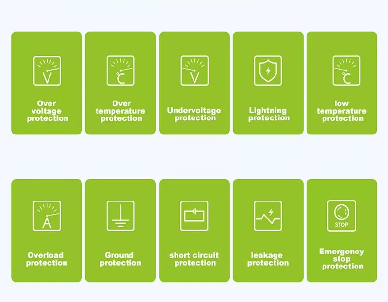Over Current, Under Voltage, Residual Current, Surge Protection, Leakage Protection, Short Circuit, Over Temperature, etc. |